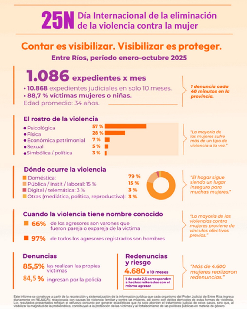 En materia de riesgo, se registraron 4.680 episodios en diez meses, y 1 de cada 2,3 corresponde a hechos reiterados con el mismo agresor. “Más de 4.600 mujeres realizaron redenuncias”.