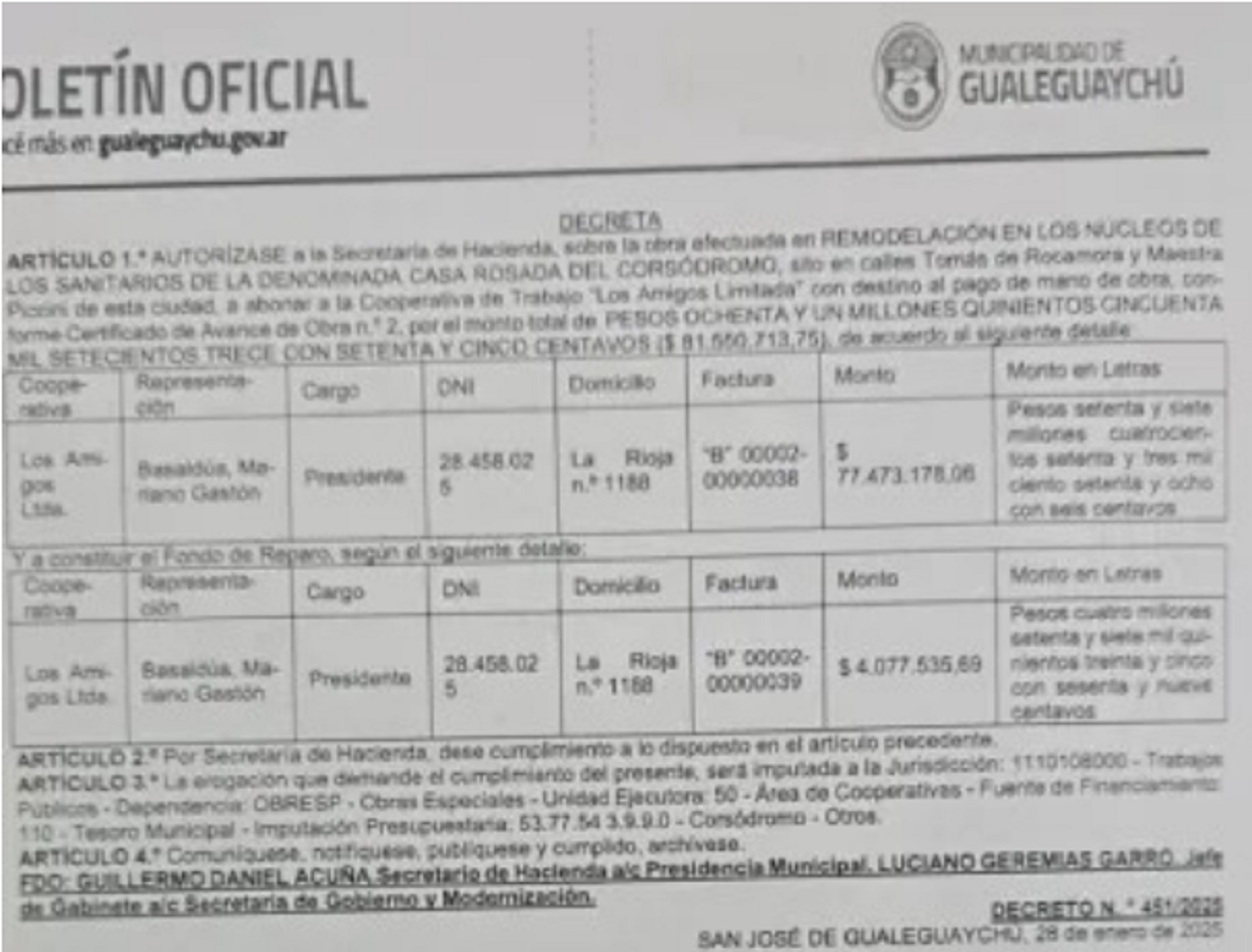 Según documentos oficiales, en menos de treinta días la cooperativa obtuvo adjudicaciones que abarcan desde trabajos en el Corsódromo hasta tareas en el Ecoparque. El principal pago autorizado —más de 81 millones de pesos— corresponde a obras de remodelación en los núcleos sanitarios de la llamada Casa Rosada del Corsódromo, mediante el Decreto 450 del 28 de enero. Ese decreto lleva la firma de Garro.