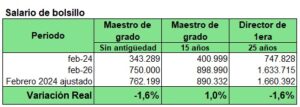 Un maestro de grado sin antigüedad pasó de percibir 343.289 pesos en febrero de 2024 a 750.000 pesos en febrero de 2026. Si ese salario inicial se actualizara por inflación, debería ubicarse en torno a los 762.199 pesos. Es decir, la variación real fue de -1,6%, muy cercana al equilibrio.