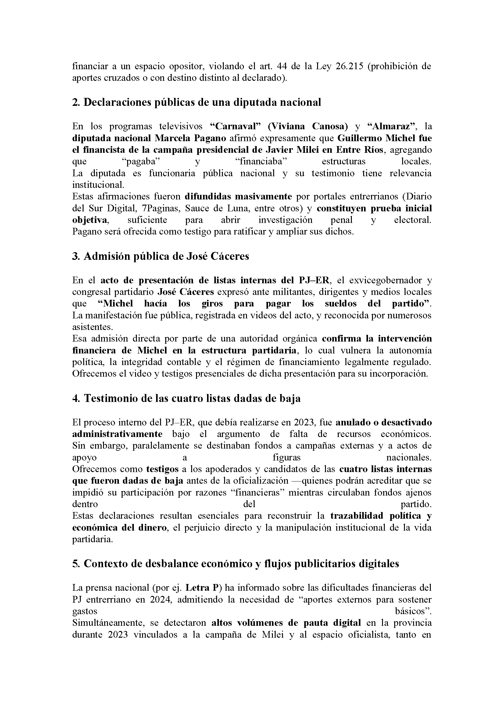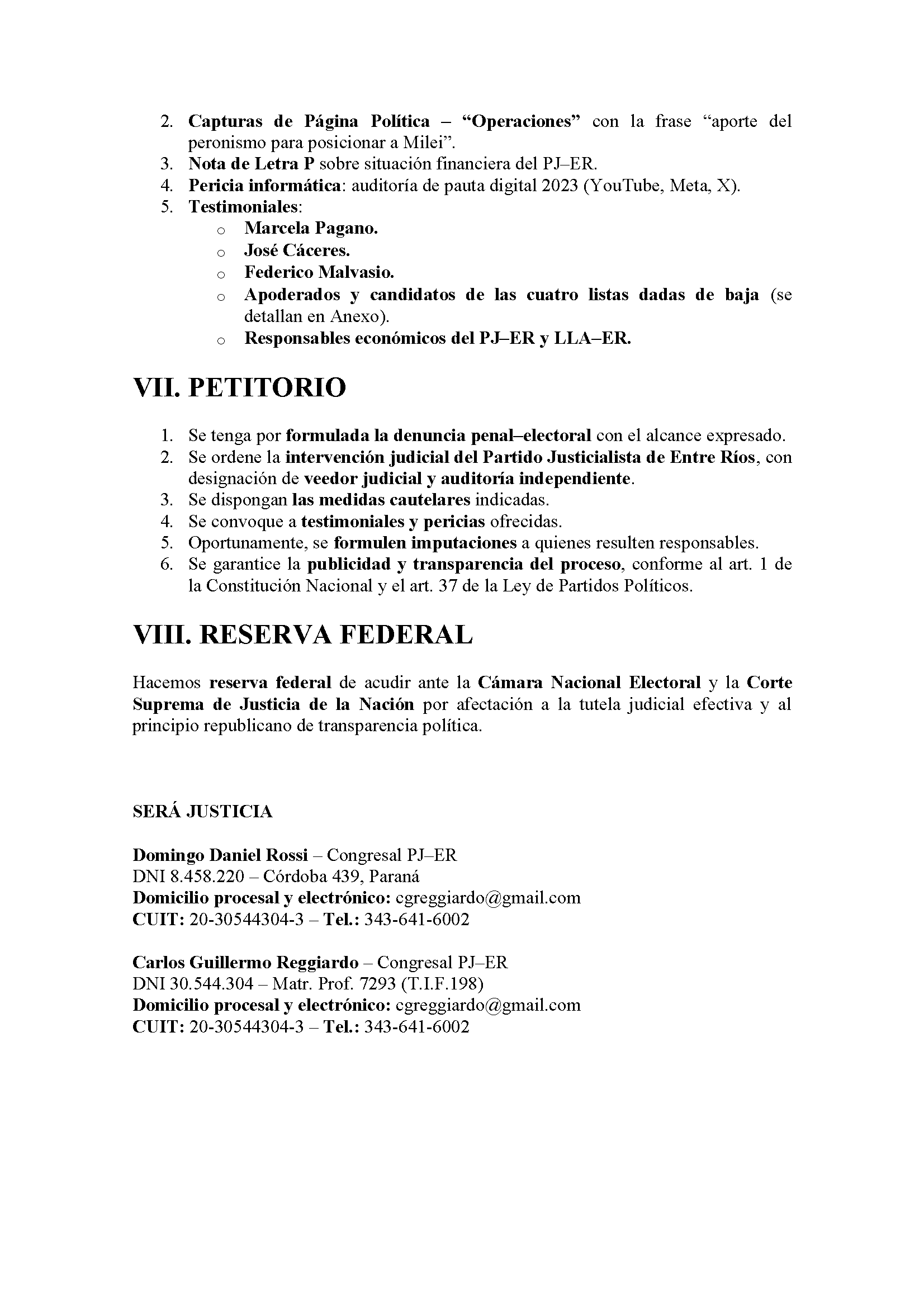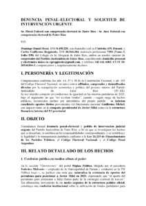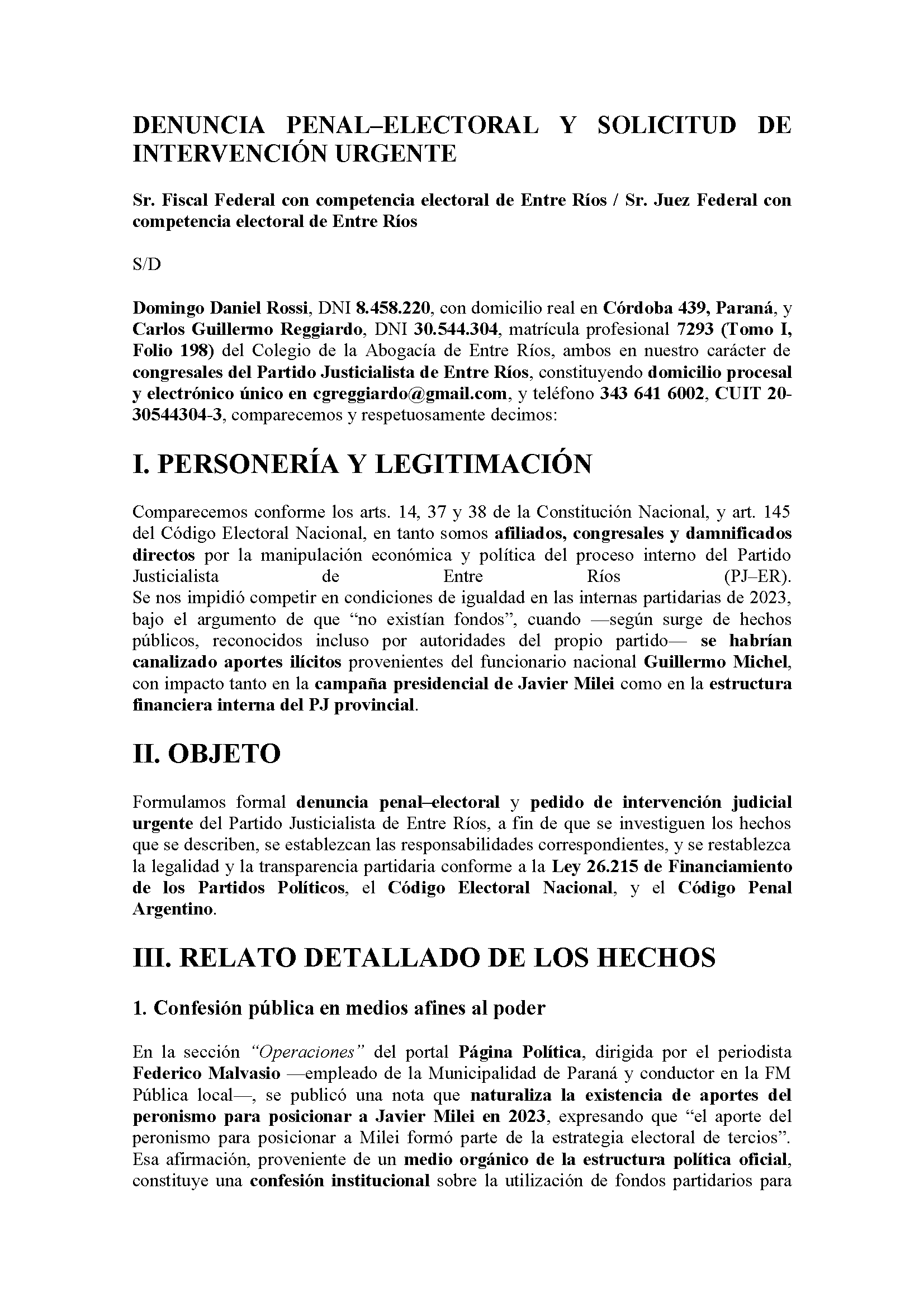 Los congresales del Partido Justicialista de Entre Ríos, Domingo Daniel Rossi y Carlos Guillermo Reggiardo, presentaron una denuncia penal–electoral ante el Fiscal Federal y el Juez Federal con competencia electoral, solicitando la intervención judicial urgente del PJ entrerriano. La presentación apunta a investigar presuntas irregularidades en el financiamiento partidario y su eventual vinculación con la campaña presidencial de Javier Milei en 2023.