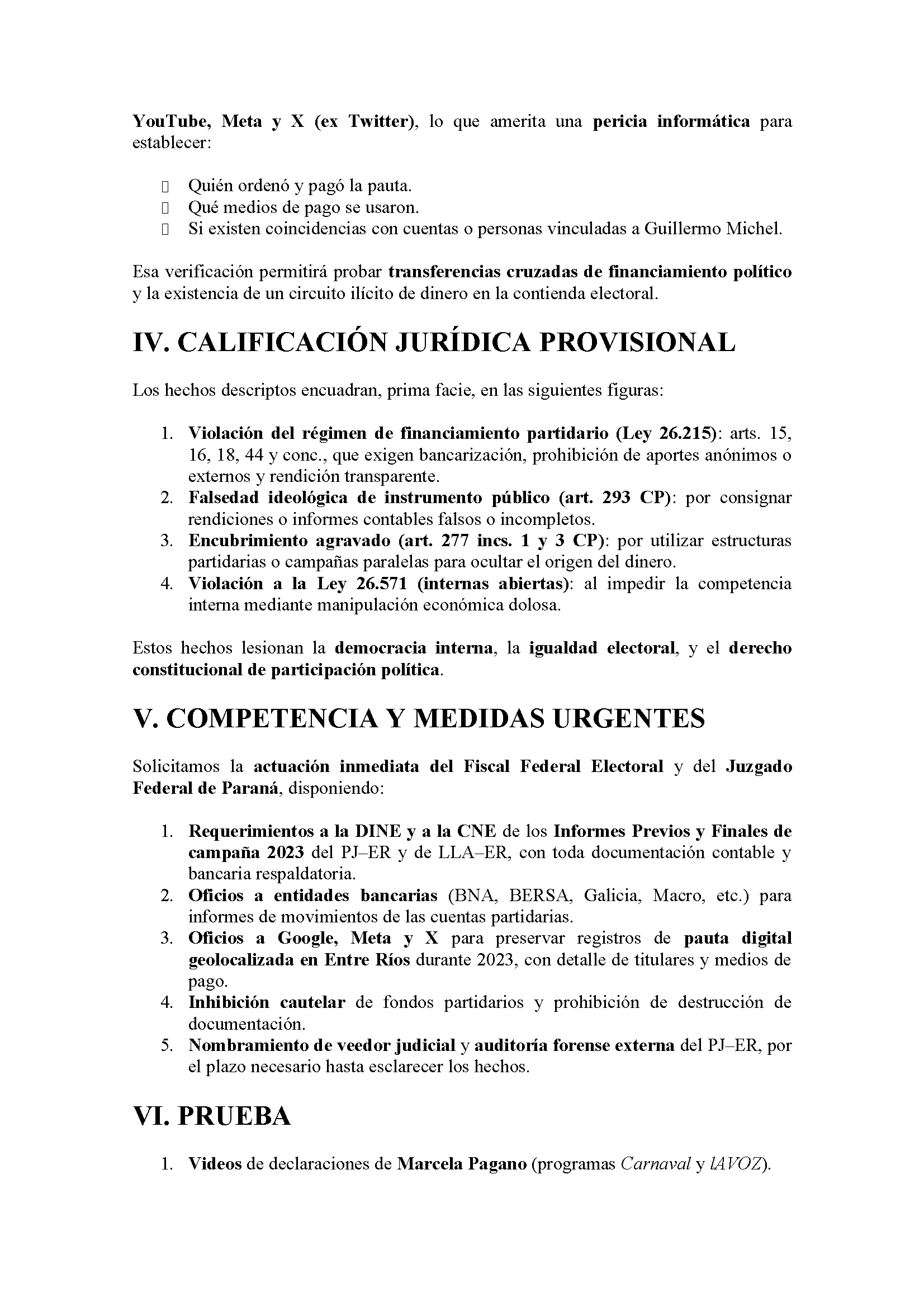 - Declaraciones televisivas de la diputada nacional Marcela Pagano, quien afirmó que Michel “pagaba y financiaba estructuras locales” para Milei.