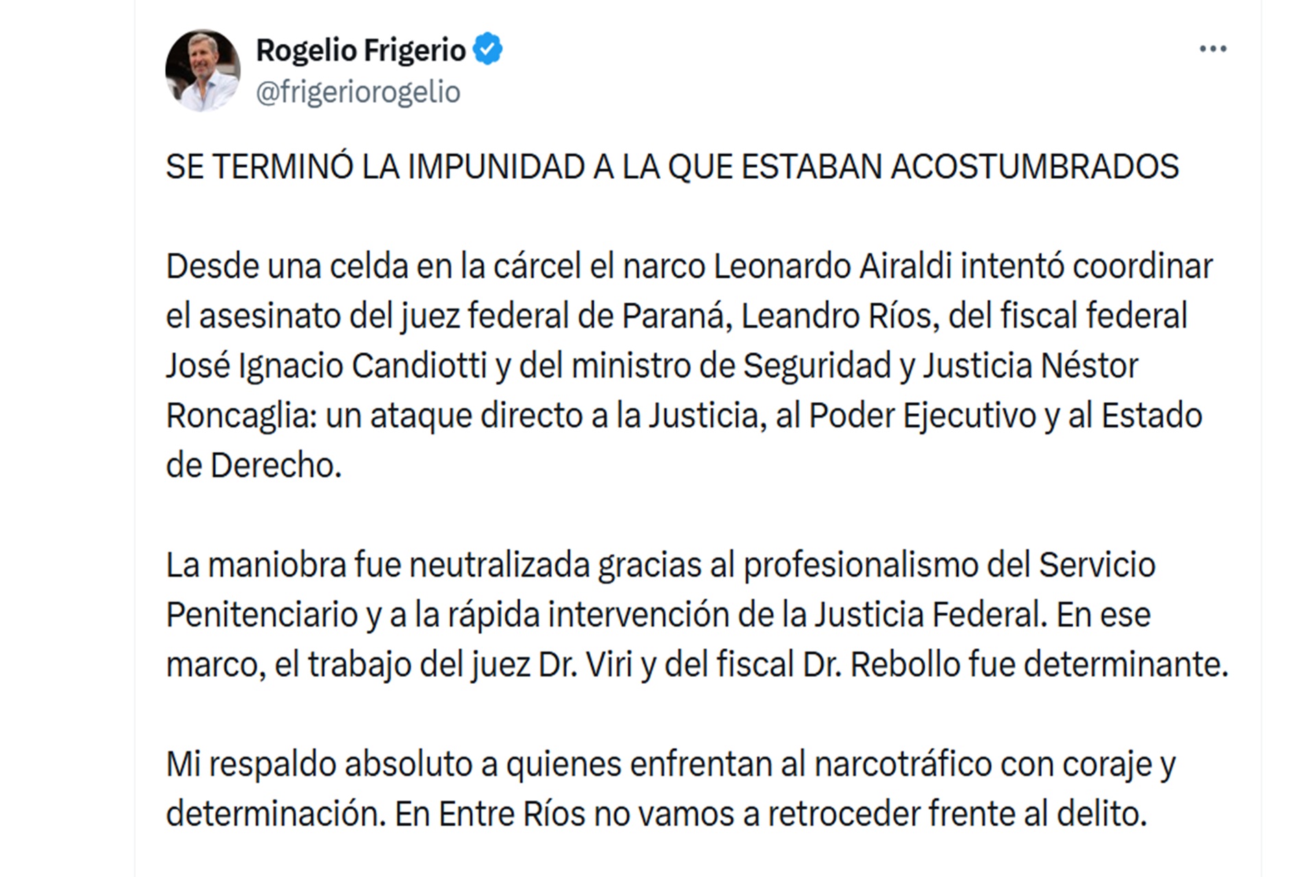 «Mi respaldo absoluto a quienes enfrentan al narcotráfico con coraje y determinación. En Entre Ríos no vamos a retroceder frente al delito», concluyó el gobernador.