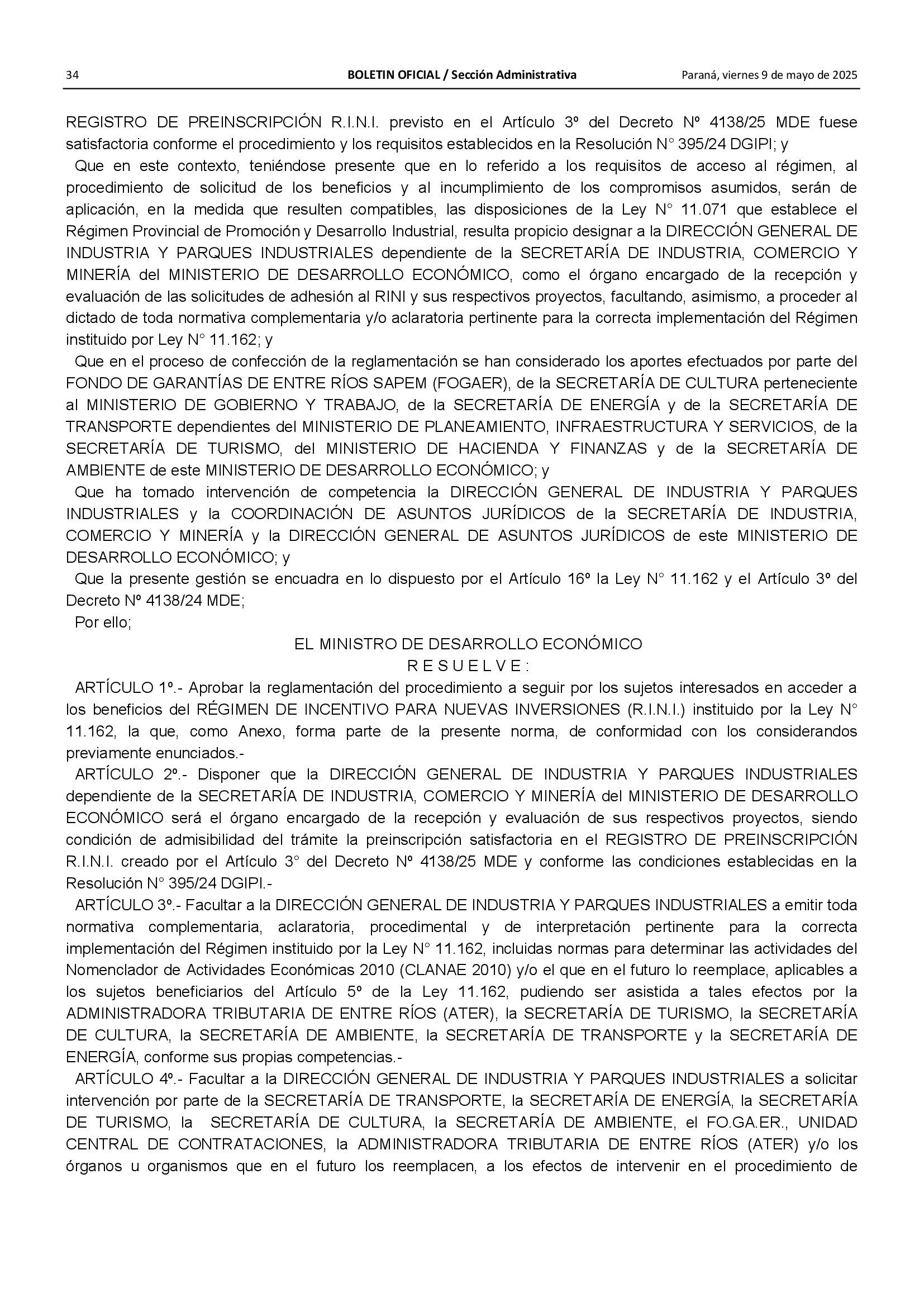 El Ministerio de Desarrollo Económico de Entre Ríos reglamentó el procedimiento que deberán seguir quienes deseen adherirse al Régimen de Incentivo a Nuevas Inversiones (RINI). Esta medida tiene como objetivo dinamizar la economía provincial mediante la radicación de nuevos proyectos en sectores estratégicos.