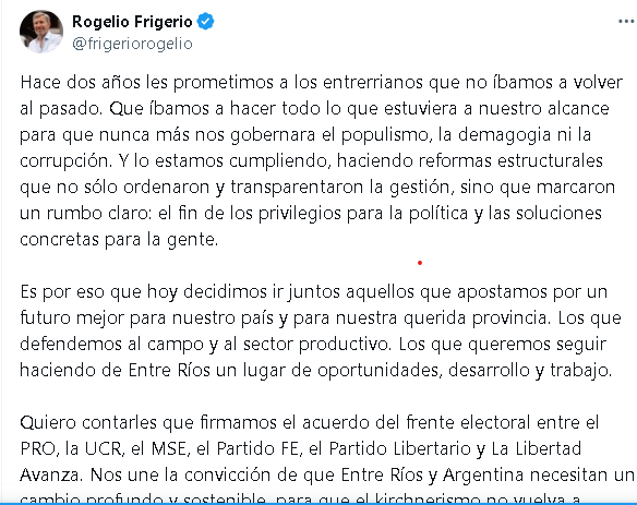 «Quiero contarles que firmamos el acuerdo del frente electoral entre el PRO, la UCR, el MSE, el Partido FE, el Partido Libertario y La Libertad Avanza. Nos une la convicción de que Entre Ríos y Argentina necesitan un cambio profundo y sostenible, para que el kirchnerismo no vuelva a apropiarse de nuestro futuro, y podamos poner a nuestra provincia definitivamente de pie», concluyó el Gobernador.