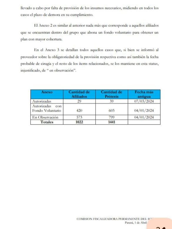 En base a los resultados de una auditoría interna en el área de prestaciones de Iosper se pudo determinar que al 10 de diciembre último el Iosper «tenía un total de 1.022 cirugías abiertas en sistema, es decir, `pendientes` ante la falta de entrega del elemento requerido (prótesis/material protésico), las cuales ascendían a 1.441, cumplimentando, hasta dicha fecha, sin objeción alguna con el pago de la cápita».
