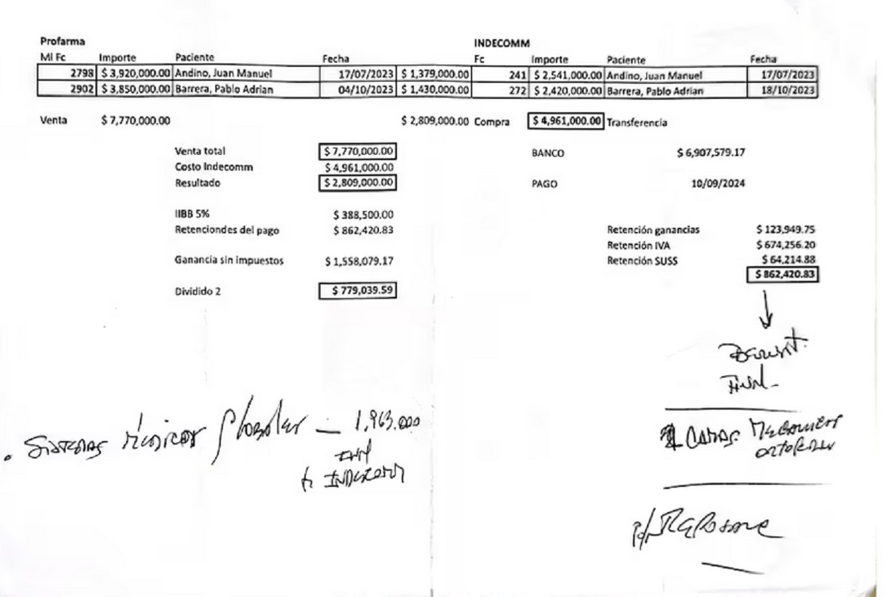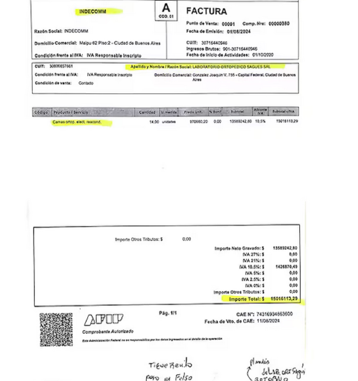 La factura se hizo, a nombre de la empresa Indecomm, propiedad de Calvete. La descripción: “camas ortopédicas eléctricas reacondicionadas”. El monto terminaría siendo levemente menor: 15 millones de pesos que fueron lisa y llanamente la coima facturada y pagada “en blanco” por las “gestiones” de Calvete para que la empresa Sagués pueda ser proveedora de Andis.