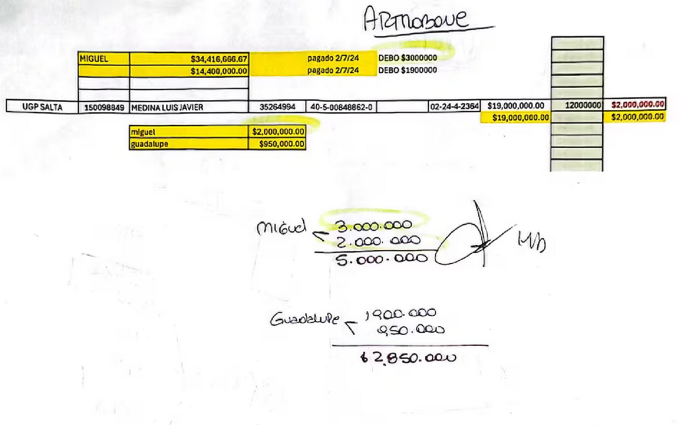 En ese marco, una planilla aportada resulta elocuente: detalla qué parte de la coima cobrada a la empresa Artrobone debía ser girada a las cuentas del propio Miguel Ángel Calvete, y también a la de su pareja, considerada la “tesorera” de la organización. La planilla con la liquidación para Artrobone por una operación de más de 48 millones de pesos, detalla un monto de 5 millones para Calvete, y otro de 2,85 millones para Guadalupe, todo con la firma del primero.