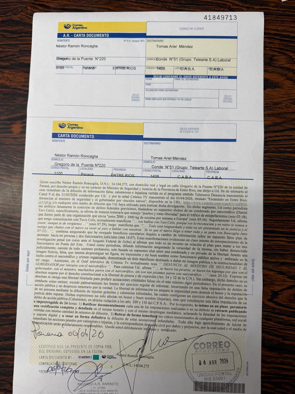 A través de las notificaciones legales, Roncaglia exige la rectificación de la información vertida en el programa, donde se sugerían conexiones entre funcionarios de alto nivel de Entre Ríos y el crimen organizado.