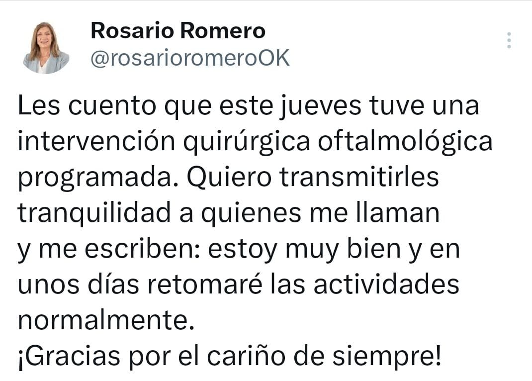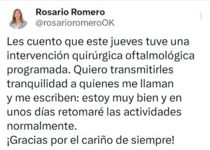 Les cuento que este jueves tuve una intervención quirúrgica oftalmológica programada. Quiero transmitirles tranquilidad a quienes me llaman y me escriben: estoy muy bien y en unos días retomaré las actividades normalmente. ¡Gracias por el cariño de siempre!.- Publico la Presidenta municipal en su red X (twitter)
