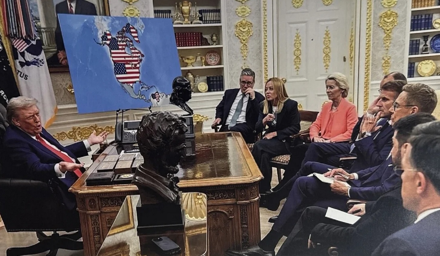 Por otro lado, Trump difundió otra imagen en la que se lo ve reunido con líderes europeos en el Despacho Oval, donde se ve un mapa detrás que muestra a Estados Unidos, Canadá, Groenlandia y Venezuela bajo la bandera estadounidense.