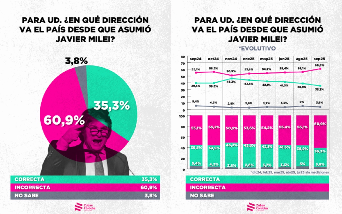 En ese marco, remarca que un 60,9% tiene una valoración negativa del gobierno de Milei y considera que el rumbo actual «es equivocado». La encuestadora sostiene que esta llegada al «techo psicológico del 60% debería alarmar al oficialismo».